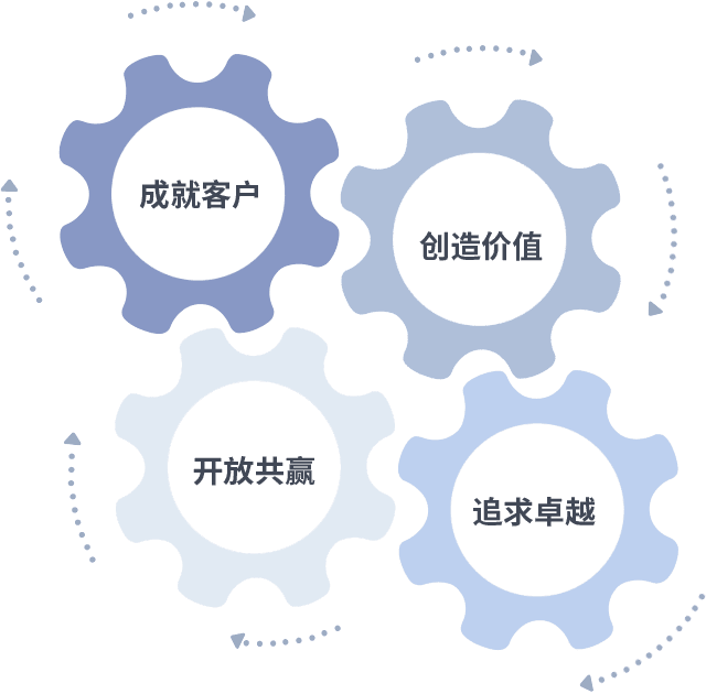 成就客户是一切决策的出发点,,,创造价值是衡量所有工作的标准,,,追求卓越是我们做事做人的态度,,,,开放共赢是我们的格局也是最终的结果。。价值观的齿轮环环相扣,,,推动着组织里的每个人不断向前。。
